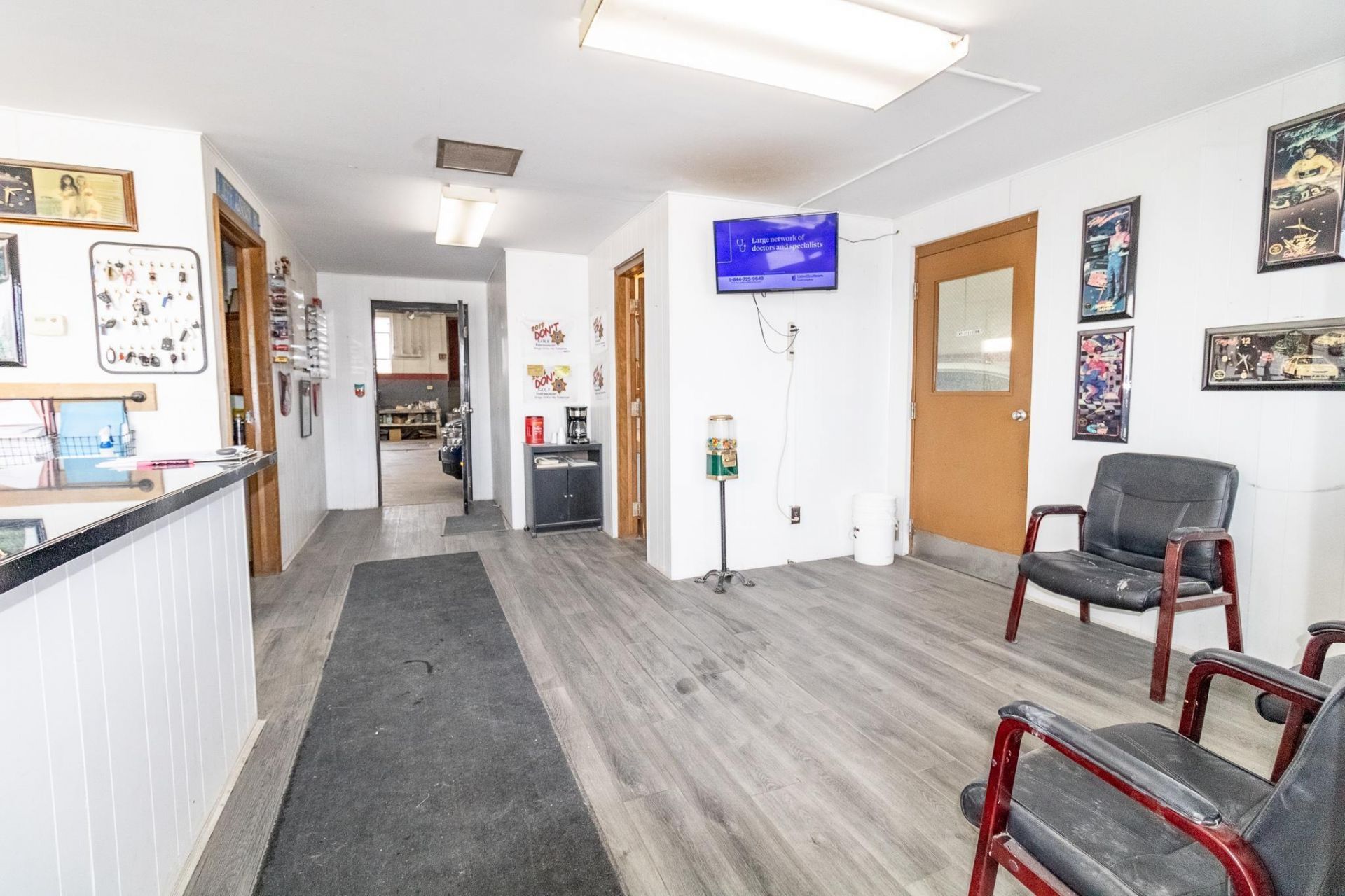 Ideal location for autobody business! 8520 sq. ft. repair shop space with several interior bays, 4 overhead doors, 2 paint booths, ample exterior storage area. Includes office area with reception desk, lobby area and private office space.